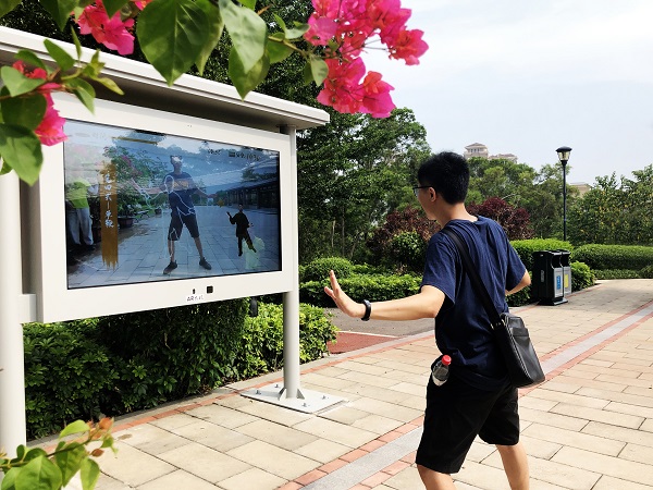 接下來我們去體驗那里的AR太極,AR太極是傳統的太極與AI和AR技術相結合,實現面對面實時的虛擬教學。參與者只需要按照智能大屏提示舉起右手,通過人工智能領域人體肢體識別技術判斷后自動開啟互動。過程中會自動識別并計算參與者動作并給與相應分數,無論您會不會太極拳,跟著這位“太極大師”都能打得很好。AR太極將會給您帶來無限的運動樂趣。